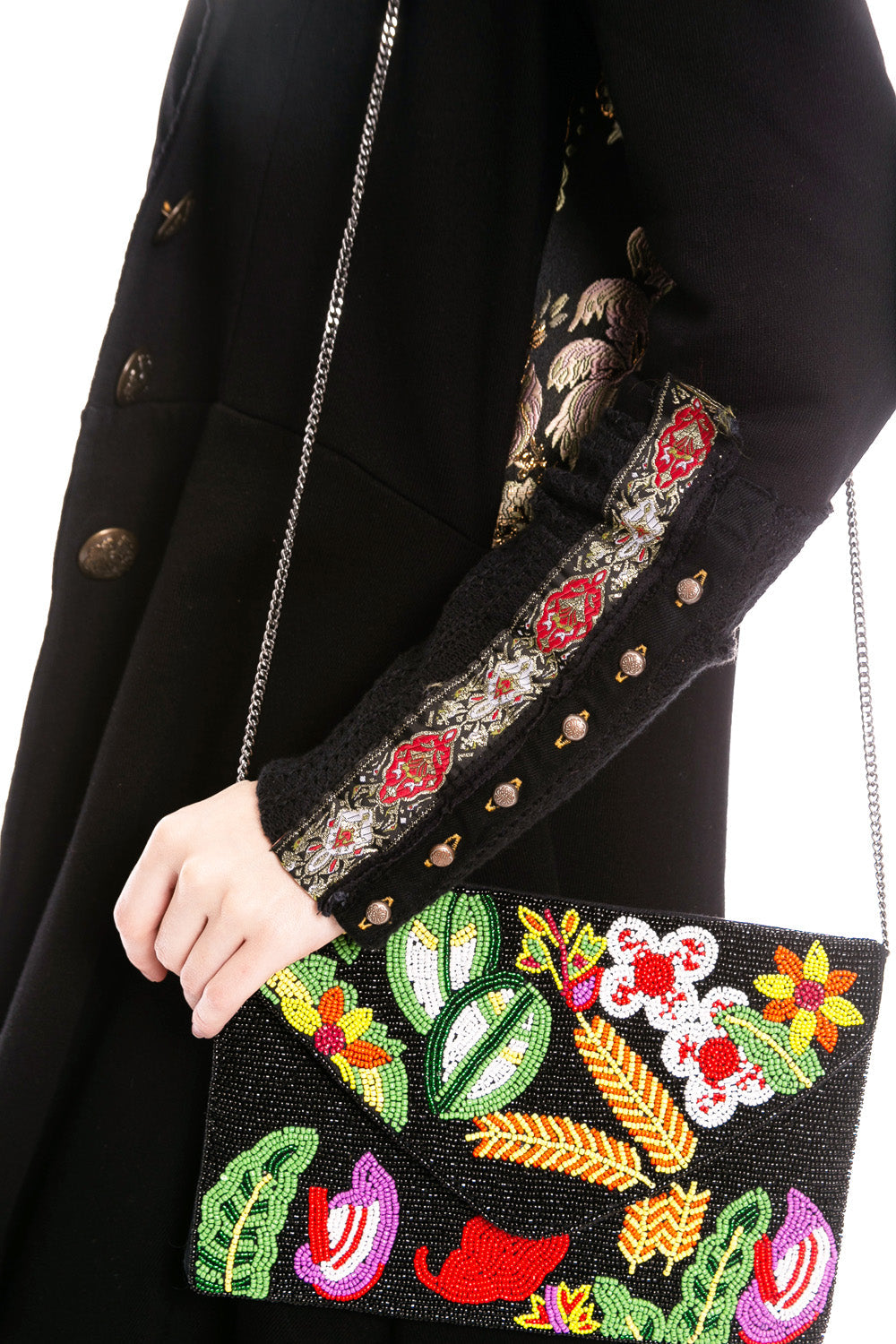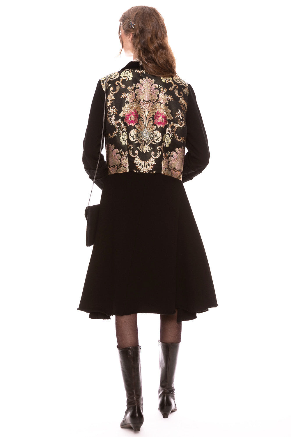 French terry button-down coat, velvet collar/lapel, floral jacquard upper back, jacquard trim sweater knit cuffs, 2 side pockets