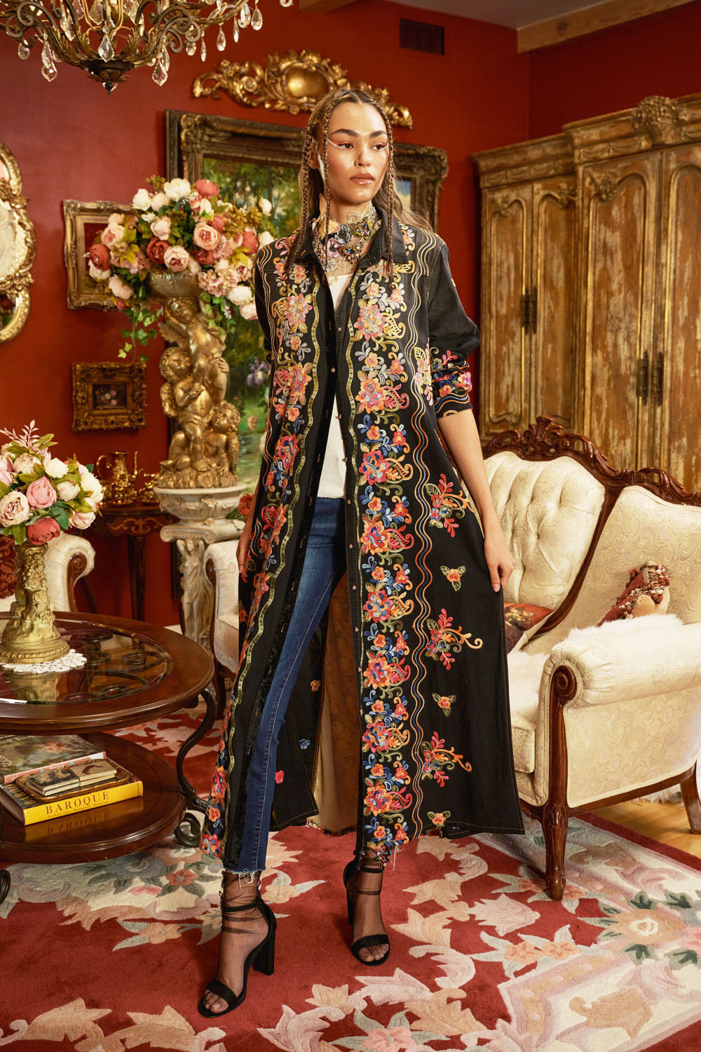 - Embroidered button-up duster with floral print velvet CB panel, velvet CF placket, 2 side pockets, side slits