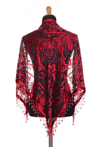 Clio Red and Black Velvet Floral Burnout Beaded Medallion Triangle Shawl