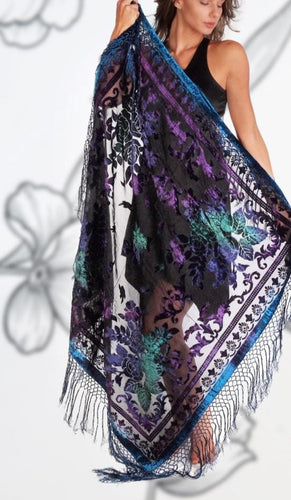 Thetis Blue-Purple-Green Velvet Floral Burnout Square Shawl