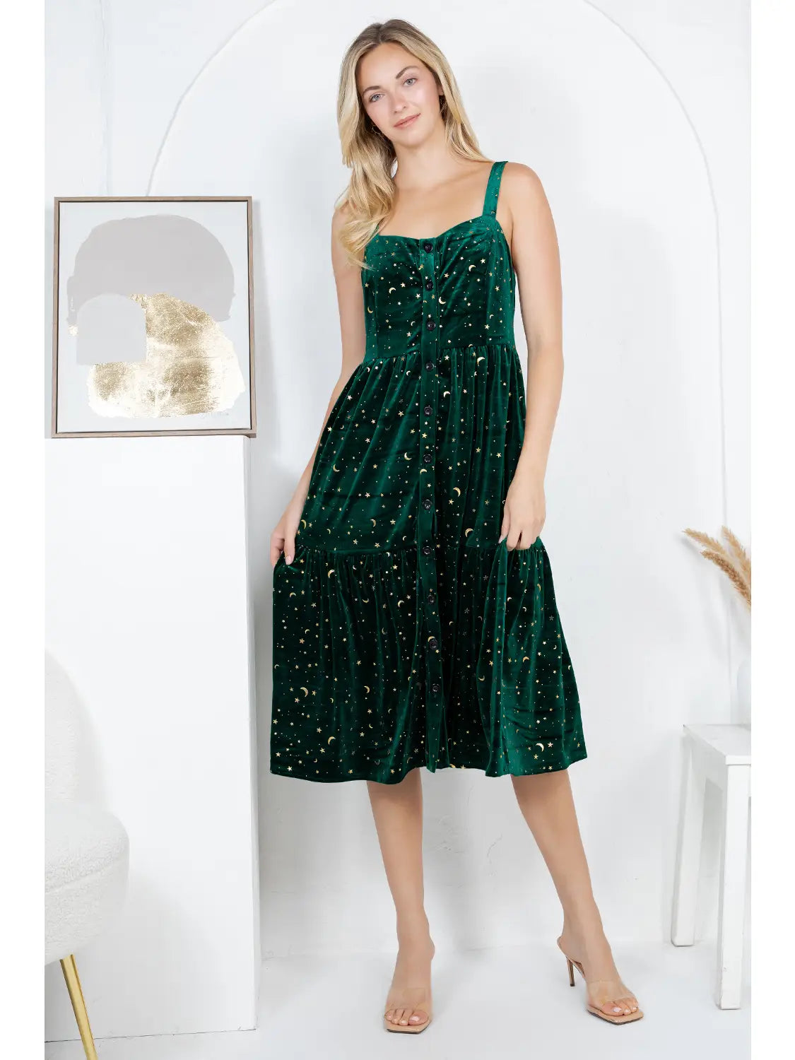 Our Emerald Velvet Celestial Cami Maxi Dress turns heads with its rich green velvet and smocked bodice that sculpts your figure fearlessly. Delicate cami straps add a seductive edge, while subtle moon and star patterns ignite your cosmic allure. This dress moves with you, blending bold comfort and celestial charm for when you want to rule the night.