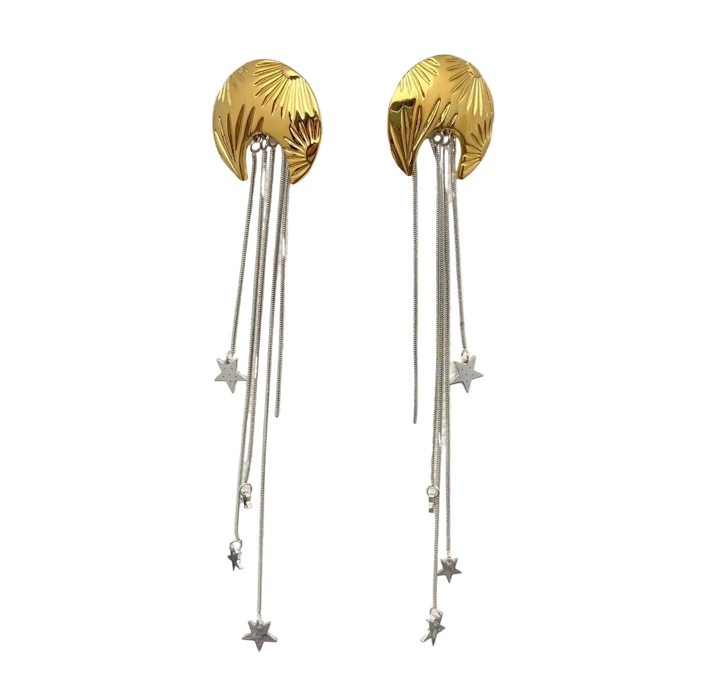 Making wish on these shooting star earrings! These crescent moon and shooting star dangles bring cosmic charm to your everyday style. Constructed from durable 316L stainless steel with an elegant 18K gold plating, they're built to last without tarnishing.
