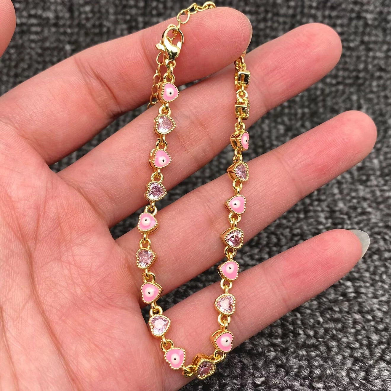Crafted from high-quality copper, shimmering zircon, and vibrant enamel, then finished with 18K gold plating, it's a stunning piece that catches the light beautifully. The nickel-free design ensures comfort for sensitive skin. With an adjustable 5mm chain measuring 180mm plus a 50mm extension, it fits most wrists perfectly. Layer it solo or stack it with your favorite pieces for an effortlessly chic look.