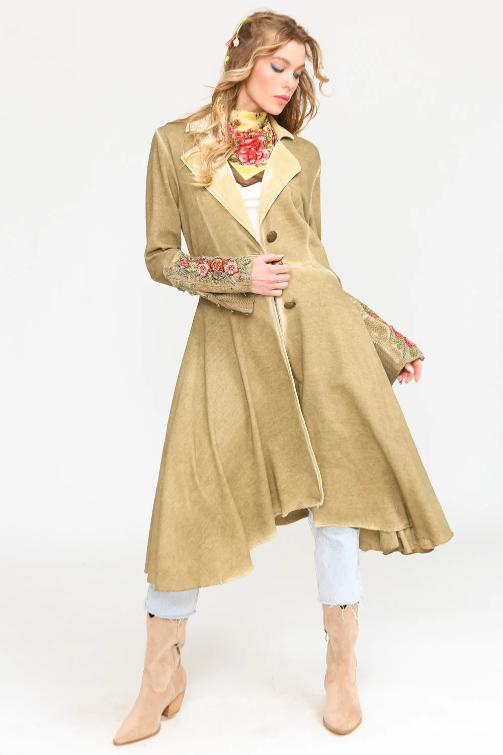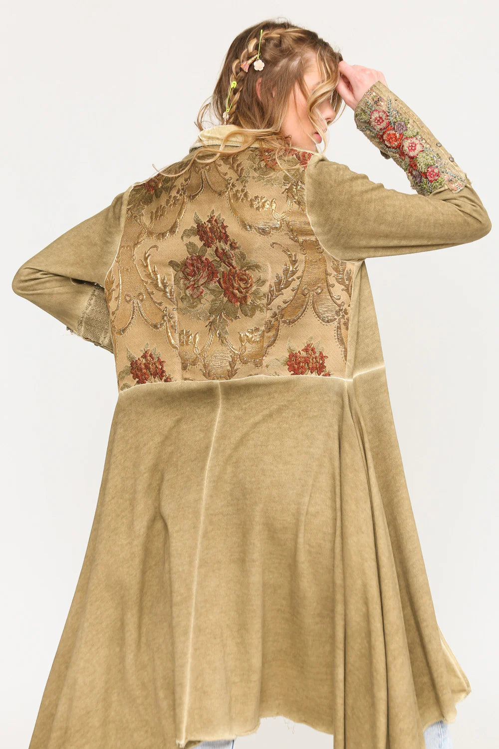 - Washed French terry button-down coat, velvet collar/lapel, floral jacquard upper back, embellished floral trim sweater knit cuffs, 2 side pockets