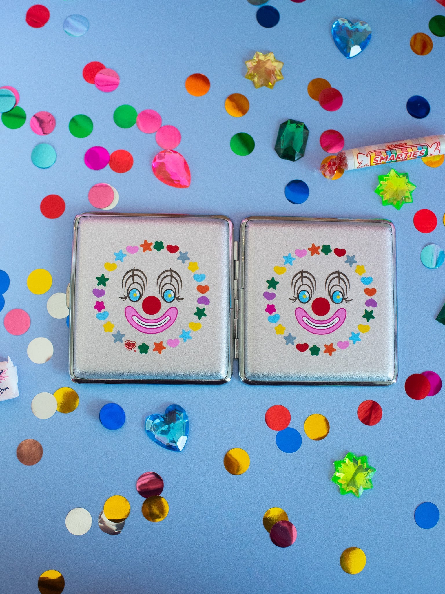 Both sides feature a smiling clown surrounded by a rainbow of stars and hearts on a shimmery, silver background!