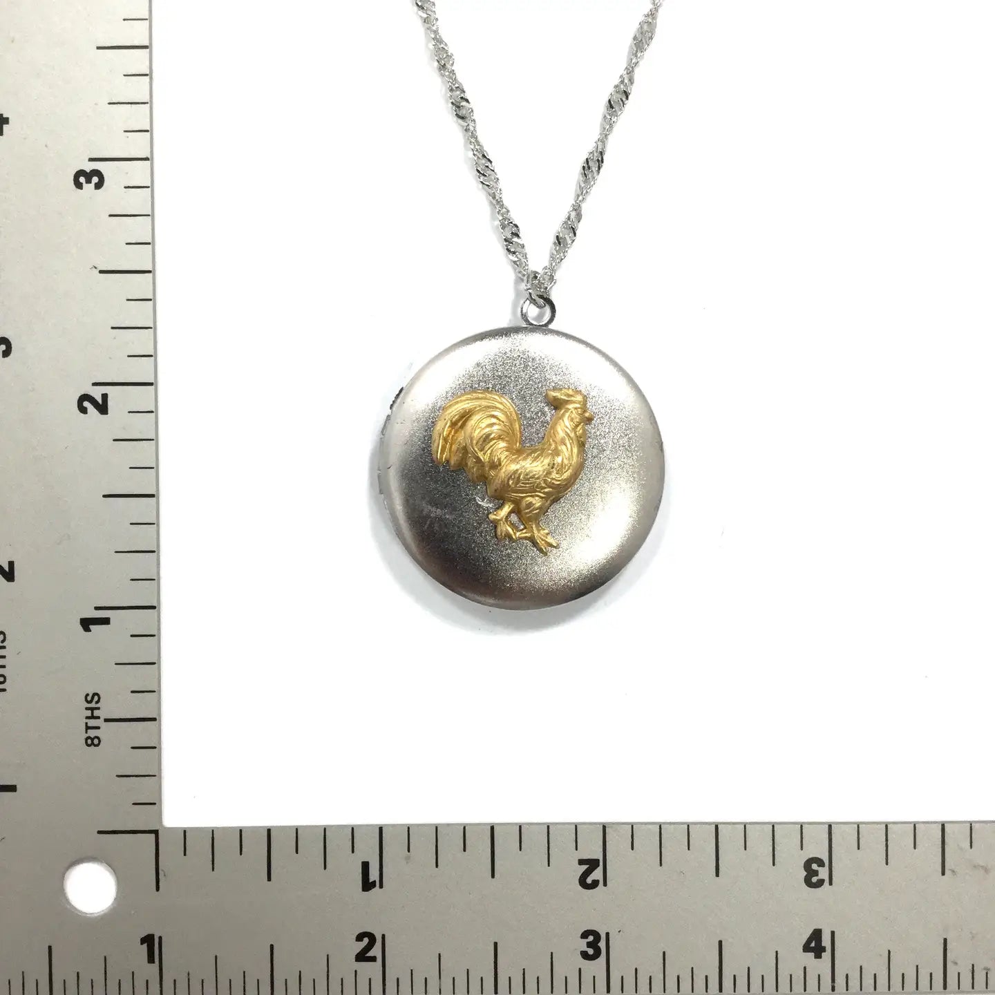 Chicken Locket Pendant Necklace Chain: Silver Plated over Brass, Burnished Silver approx. 24" Pendant (Silver): Silver/Gold Plated over Brass, approx. 1.4" x 1" Pendant (Hematite/Gold): Gold Plated over Brass, Silver Plated over Brass, Burnished Silver, approx. 1.25" x 1.25"