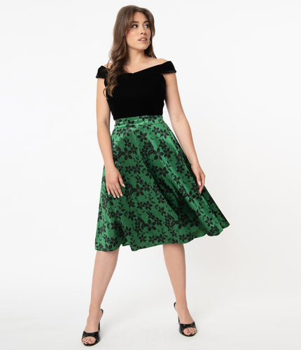 Green Velvet and Black Floral High Waist Vivien Swing Skirt