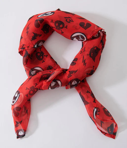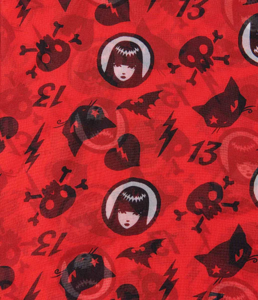 This delightful 1950s hair scarf, in collaboration with Emily the Strange, is crafted in a sheer chiffon-style fabric that dances with Emily, her cat, broken hearts, skulls, and the number 13 throughout the sheer red mesh.