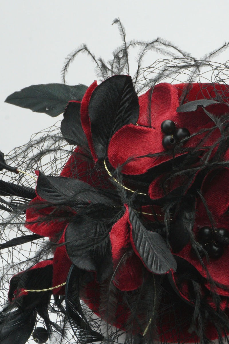 Show-stopping red velvet fascinator adorned with dramatic black feathers, delicate satin flowers in red and black, and sparkling bead details, this accessory brings instant glamour to any occasion. The sheer net panel adds an elegant touch of mystery. Crafted from 100% polyester for easy care and lasting wear. Perfect for weddings, parties, or whenever you want to turn heads with a touch of vintage-inspired flair.