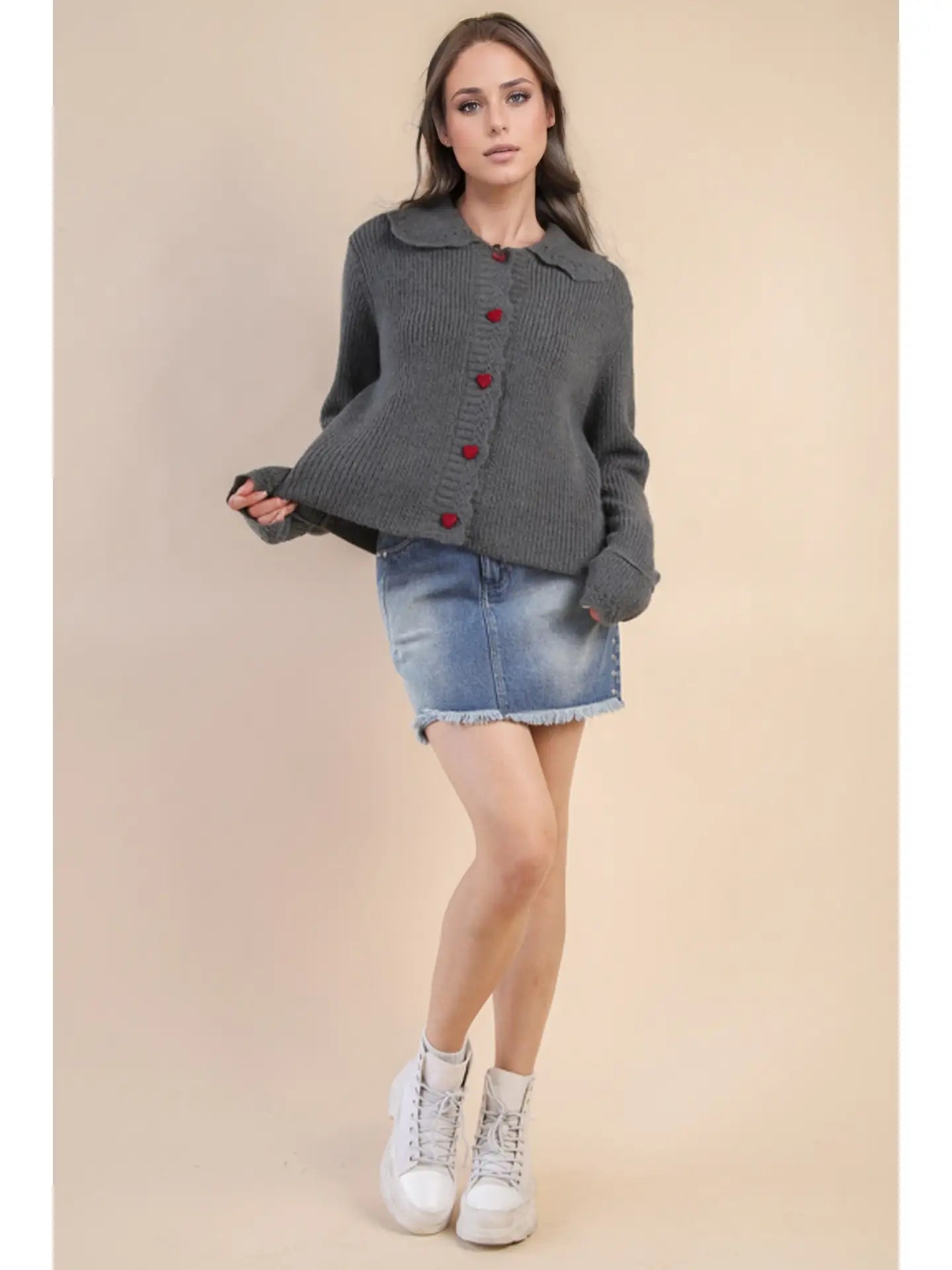 Cozy up in this charming gray cardigan that's as sweet as it is stylish! Featuring delicate doily knit details on the collar and cuffs, this piece brings a touch of vintage-inspired elegance to any outfit. The real showstopper? Red knit heart-shaped buttons down the front, made with soft yarn that feels like a warm hug. Perfect for layering over your favorite tees or dresses, this cardigan combines playful personality with everyday comfort. A must-have for anyone who loves a little extra charm in their wardrobe.