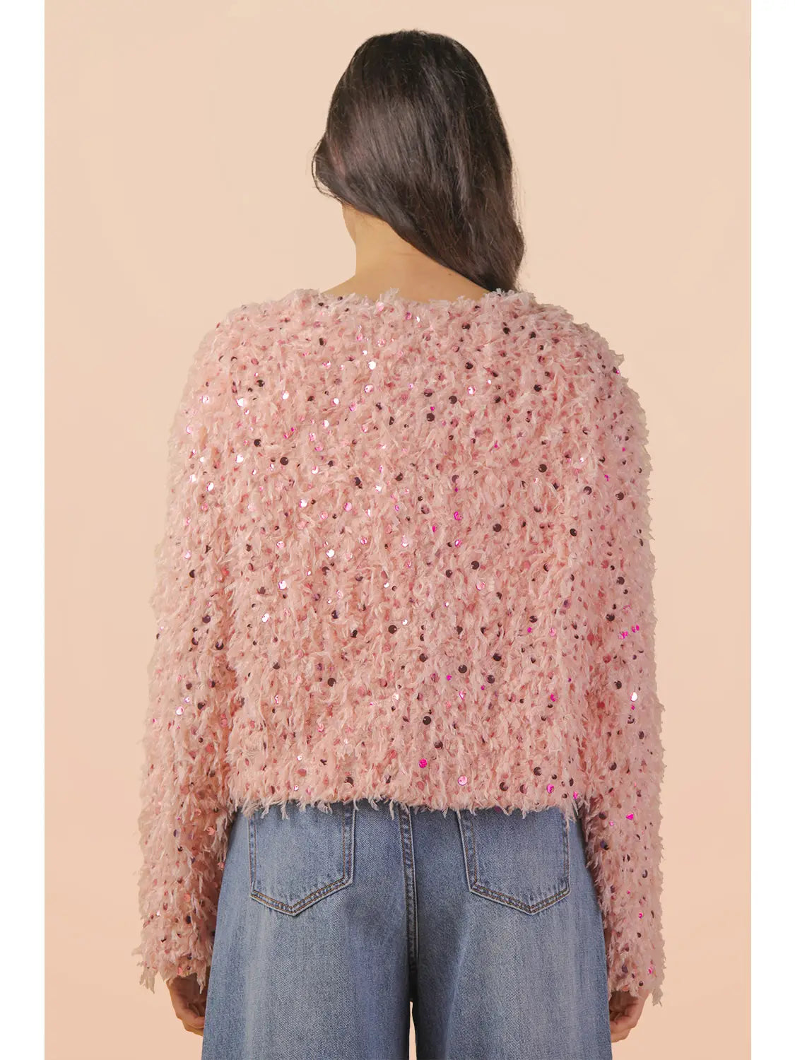 Wrap yourself in sparkle and softness with this show-stopping cardigan! Featuring a luxe blend of sequin and knit textures across the front, this piece catches the light beautifully. The velvet ties add an elegant touch, letting you cinch and style it your way. Perfect for your everyday look or adding glamour to a night out. A playful wardrobe essential that brings the glam.