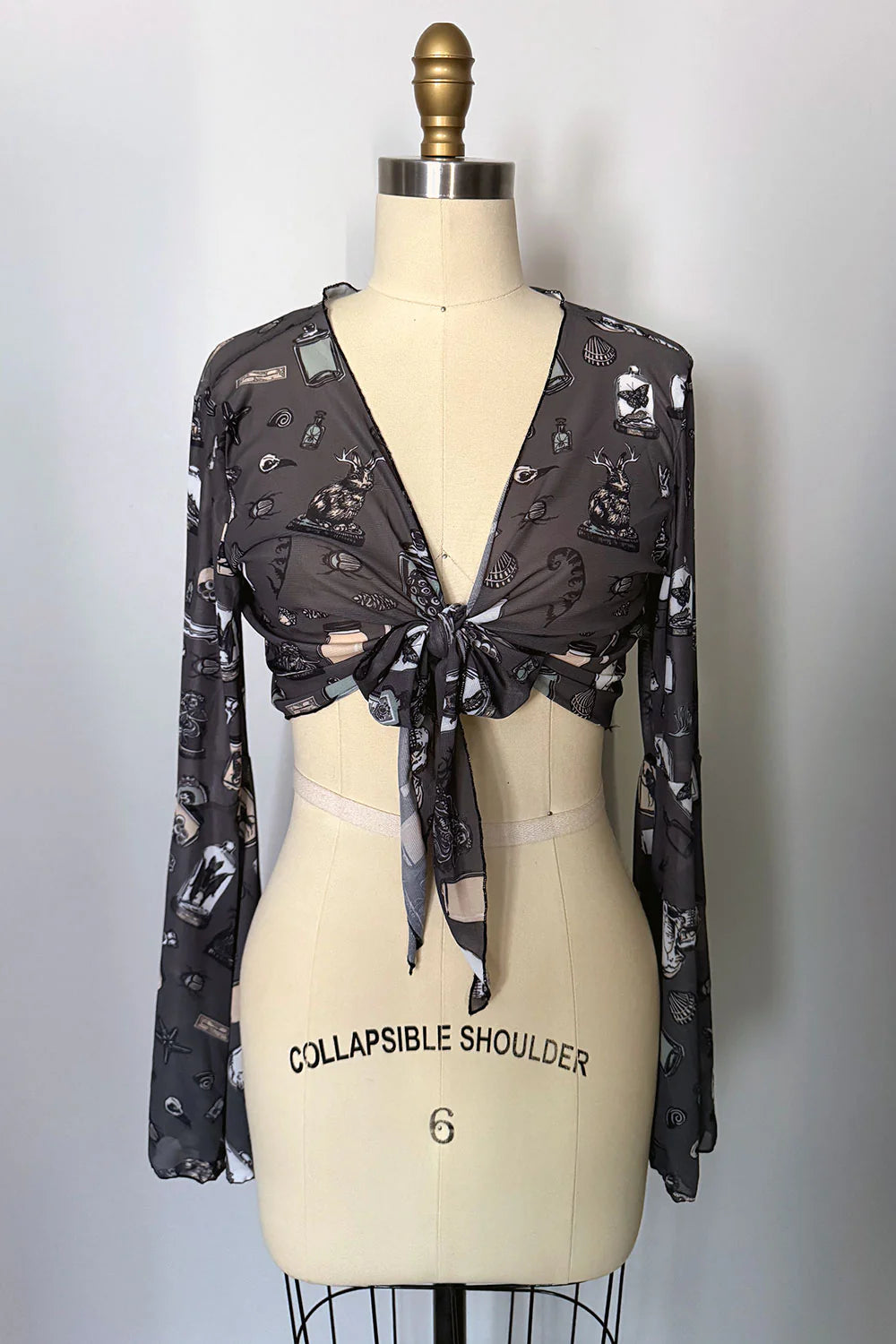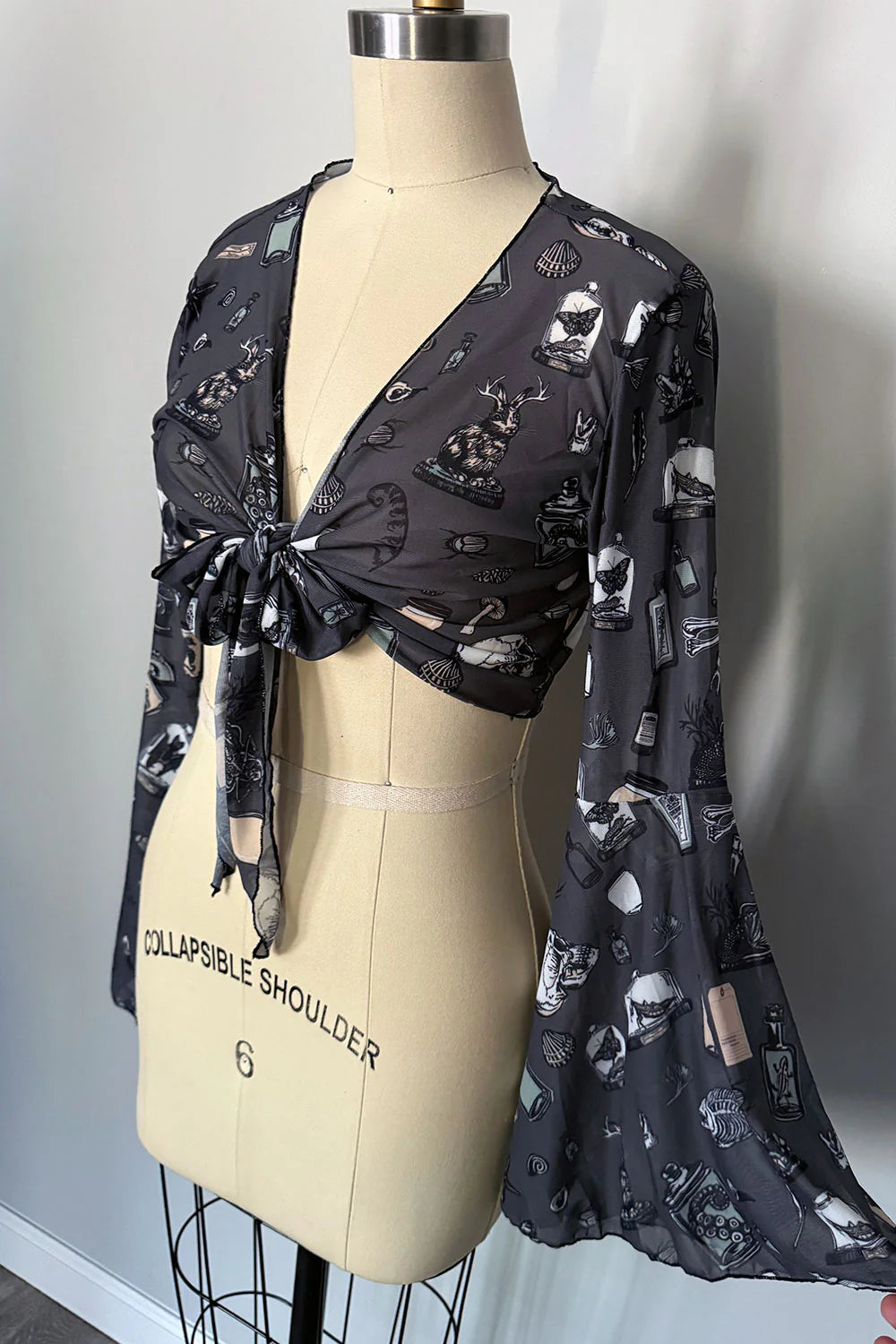Our new mesh crop tie top features our custom Rare Specimens all over print! With flare sleeves and tie front, this top is perfect for any odd babe! This top is see through mesh, it is not lined.
