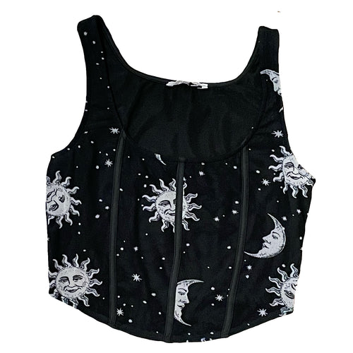 Black Celestial Moon and Stars Print Mesh Sleeveless Crop Top